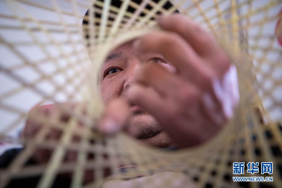云南省會(huì)澤縣大一學(xué)生王淼的父親王玉榮在家中編竹編(2月6日)。新華社記者 林碧鋒 攝