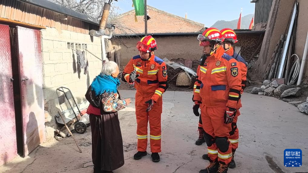 1月26日,甘肃省消防救援总队救援人员在甘南州迭部县向居民了解地震受损情况。新华社发(甘肃省消防救援总队供图)