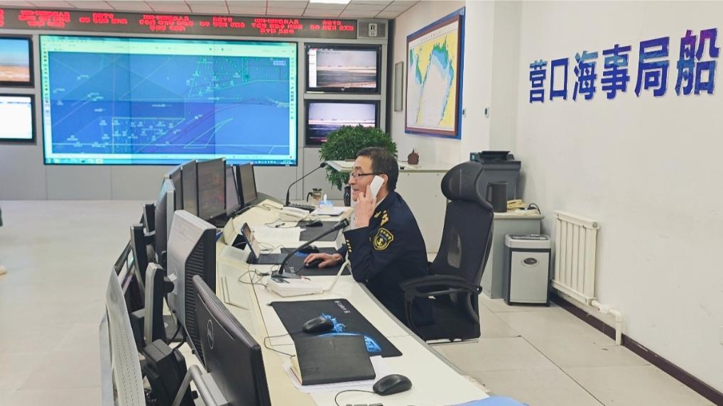 营口海事局交管中心值班人员为进出港船舶提供冰期航行安全提醒。新华社发