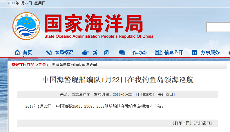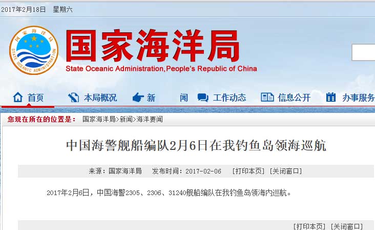 新華網北京2月18日電 據國家海洋局網站報道,2017年2月18日,中國海警2401、2337、2101、2106艦船編隊在我釣魚島領海內巡航。