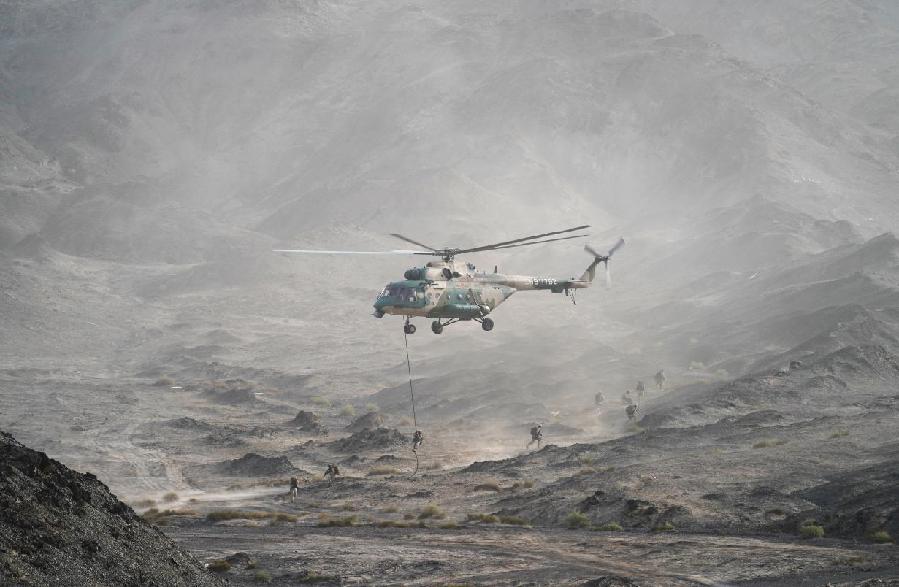 ????23日,陸軍新質(zhì)作戰(zhàn)力量演練在陸軍多個演兵場連續(xù)“打響”,8支新質(zhì)作戰(zhàn)力量輪番上陣。圖為特戰(zhàn)隊員進(jìn)行滑降。新華社記者王東明 攝