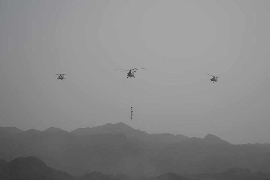 ????23日,陸軍新質(zhì)作戰(zhàn)力量演練在陸軍多個演兵場連續(xù)“打響”,8支新質(zhì)作戰(zhàn)力量輪番上陣。圖為特戰(zhàn)隊員在武裝直升機護衛(wèi)下進(jìn)行直升機懸吊撤離。新華社記者王東明 攝