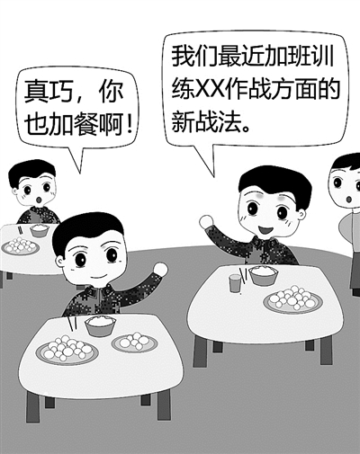 ????“真巧,你也來加餐啊?!薄笆前?,我們營最近在研訓新戰法,有時會加班訓練……我跟你說,我們研究的新戰法主要是××作戰方面,據說要在全旅推廣呢!”