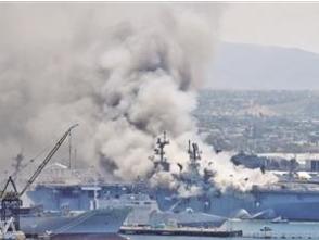 ????當地時間7月12日上午8時30分許,停泊在美國加利福尼亞州圣迭戈海軍基地的“好人理查德”號兩棲攻擊艦突發大火。“好人理查德”號屬于黃蜂級兩棲攻擊艦,滿載排水量達4萬噸,通常搭載1200名艦員。該艦發生事故時正在進行中期維護,主要對飛行甲板進行升級改造,以迎接F-35B戰斗機上艦部署。