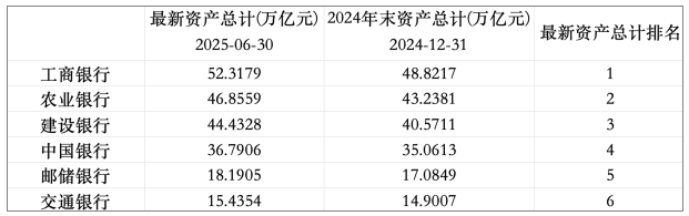 从资产规模来看,今年上半年,国有六大行资产规模均实现稳步增长。工商银行资产规模站上52万亿元台阶,稳坐头把交椅,农业银行、建设银行的资产规模均超40万亿元,分别为46.86万亿元、44.43万亿元。中国银行、邮储银行、交通银行的资产规模均较2024年末有所增长。