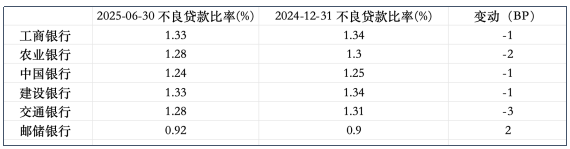 国有大行方面,资产质量整体保持稳健,不良率有所下降。工商银行与建设银行不良贷款率均为1.33%,较上年末均下降0.01个百分点,中国银行不良贷款率1.24%,同样较上年末下降0.01个百分点,交通银行、农业银行不良贷款率均为1.28%,其中交通银行较上年末下降0.03个百分点,农业银行下降0.02个百分点,邮储银行不良贷款率虽较上年末上升0.02个百分点,但其0.92%的不良率仍处于六大行中的最低水平。