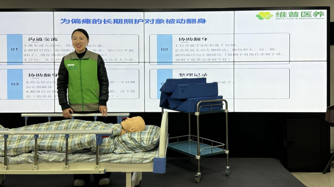 在“青岛市长期照护师培训班”上,维普培训学校采用“理论线上学、技能线下练”的融合教学模式,正使用专业教材与教具,模拟为偏瘫照护对象进行被动翻身等实操练习。