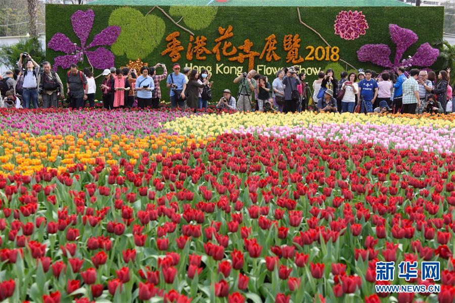 3月16日,市民在香港花卉展覽上參觀拍攝。當日,2018年香港花卉展覽在香港維多利亞公園揭幕,展出約40萬株花卉,吸引眾多市民和游客前往參觀。新華社記者 秦晴 攝