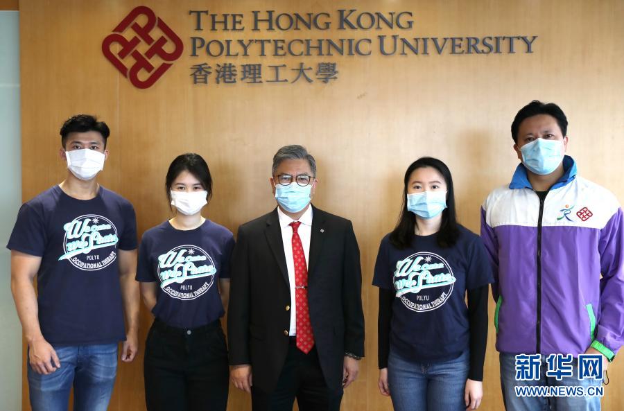 這是“愛無疆”團隊成員合影。他們是(自左至右):香港理大康復治療科學系職業治療學三年級學生李穎東、香港理大康復治療科學系職業治療學四年級學生李舒平、香港理大康復治療科學系系主任曾永康、香港理大康復治療科學系職業治療學三年級學生梁熙童、香港理大康復治療科學系職業治療臨床導師鄧健聰(2020年12月12日攝)。新華社記者 吳曉初 攝