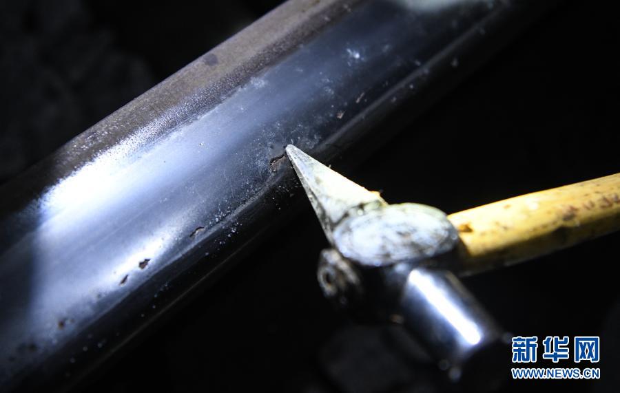 看守工廖成根在檢查傷損鋼軌(1月30日攝)。
