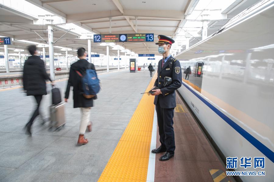 2月9日,付寶印在重慶北站站臺迎接旅客。新華社記者 黃偉 攝