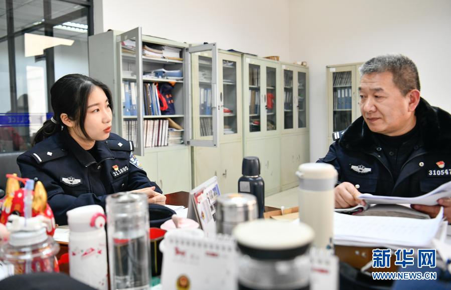 2月11日,在天津市紅橋區(qū)芥園派出所,楊曉惠向社區(qū)老民警請(qǐng)教問題。新華社發(fā)(孫凡越攝)