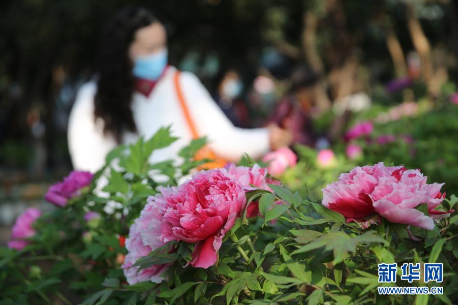 2月14日,游客在昆明市大觀公園觀賞盛開的牡丹。新華社發(梁志強 攝)