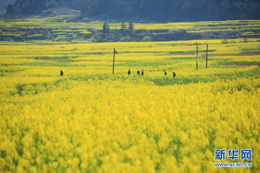 2月14日,在貴州省黔東南苗族侗族自治州黎平縣,游人在油菜花田賞花游玩。新華社發(徐基茂 攝)