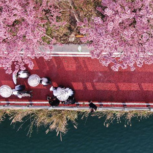 早春時節,貴州省黔東南苗族侗族自治州錦屏縣三江鎮濱江步道櫻花盛開,吸引游人前來踏春賞花。