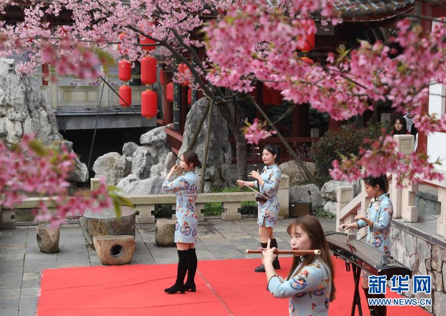 2月27日,演員在武漢東湖櫻花園表演節目。
