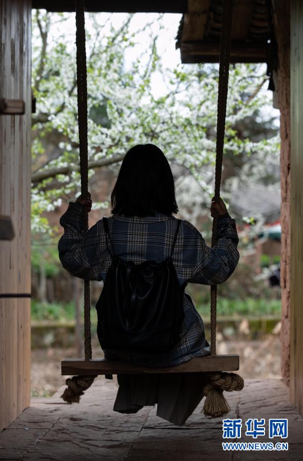 3月1日,一名游客在幸福古村蕩秋千。新華社記者 江宏景 攝