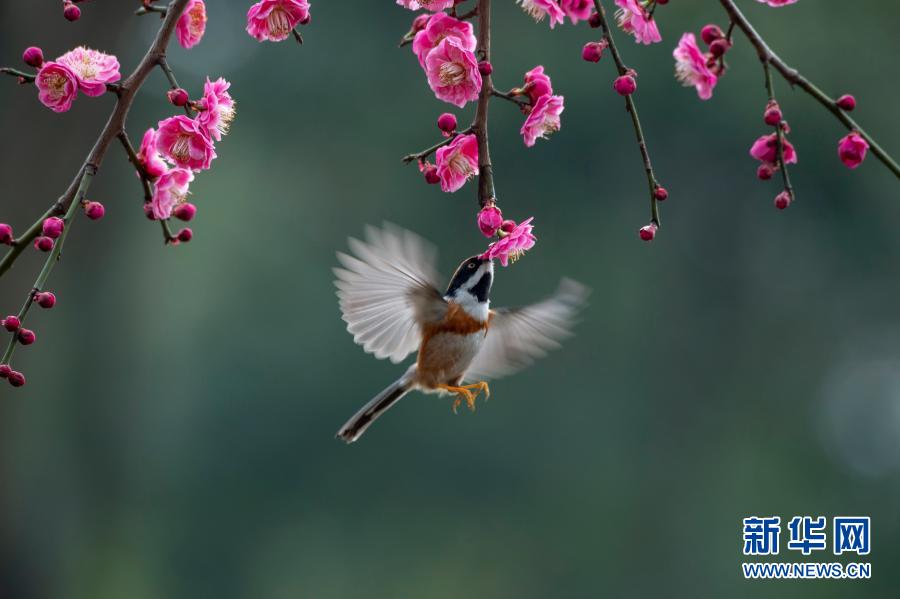 3月2日,在江蘇無錫管社山莊,小鳥在綻放的梅花下“親吻”花蕊。新華社發(潘正光 攝)