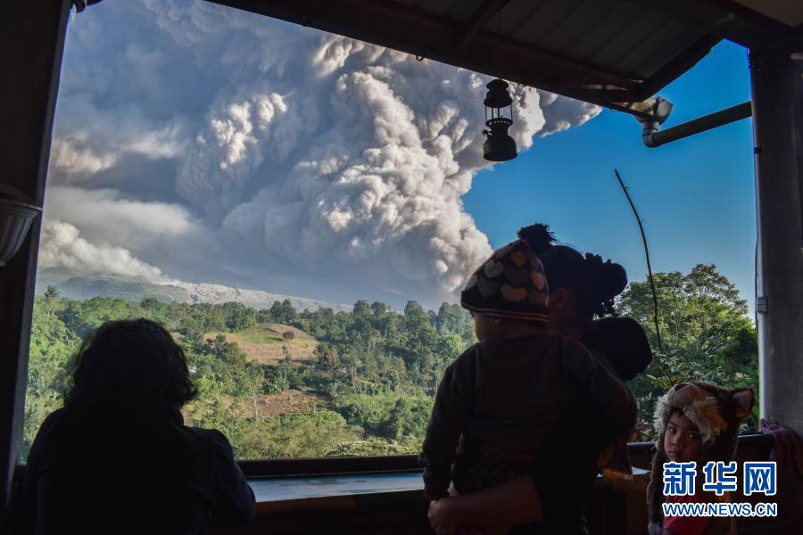 3月2日,人們在印度尼西亞北蘇門答臘省卡羅觀看噴發的錫納朋火山。新華社發(森比林攝)