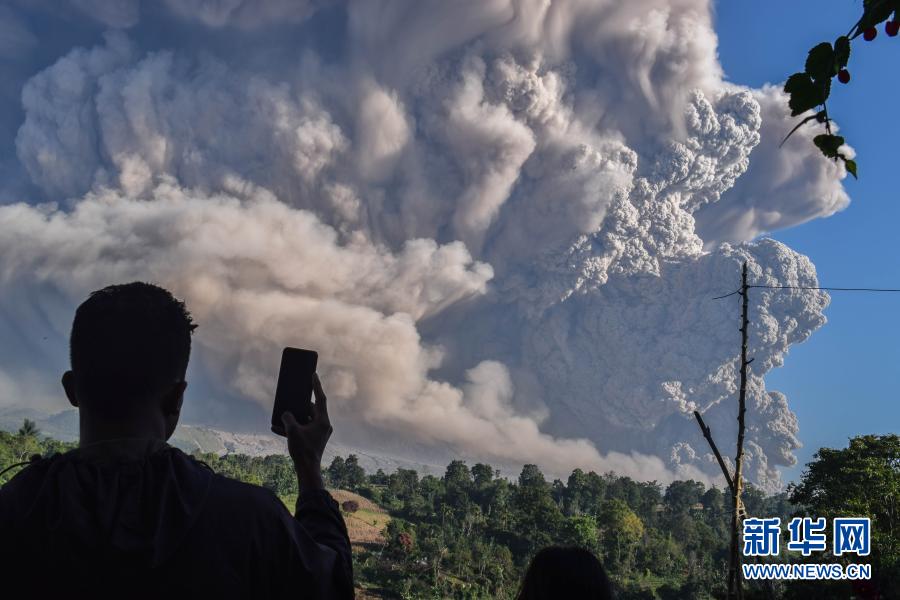 3月2日,一名男子在印度尼西亞北蘇門答臘省卡羅觀看噴發的錫納朋火山。新華社發(森比林攝)