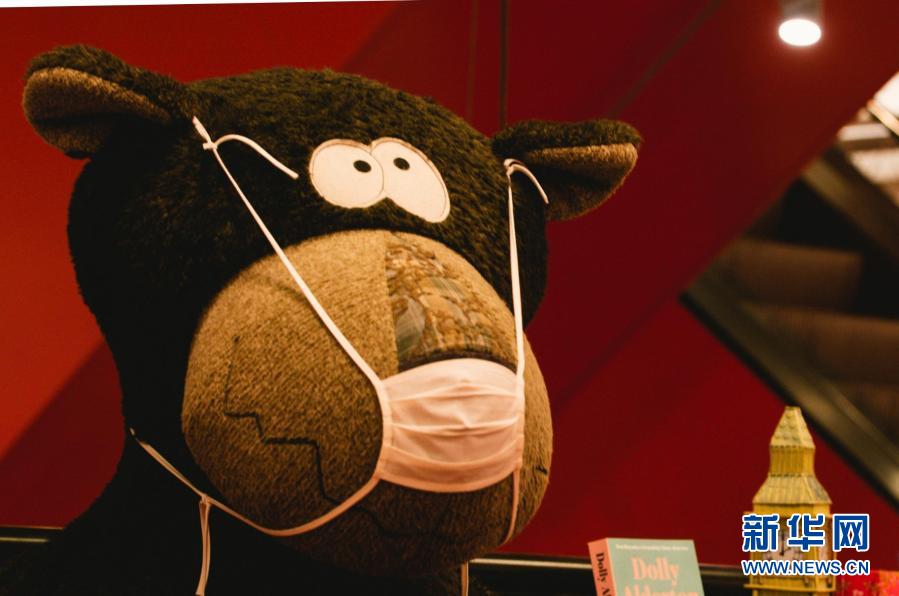 3月8日,德國科隆一家書店內的毛絨玩偶“佩戴”口罩。