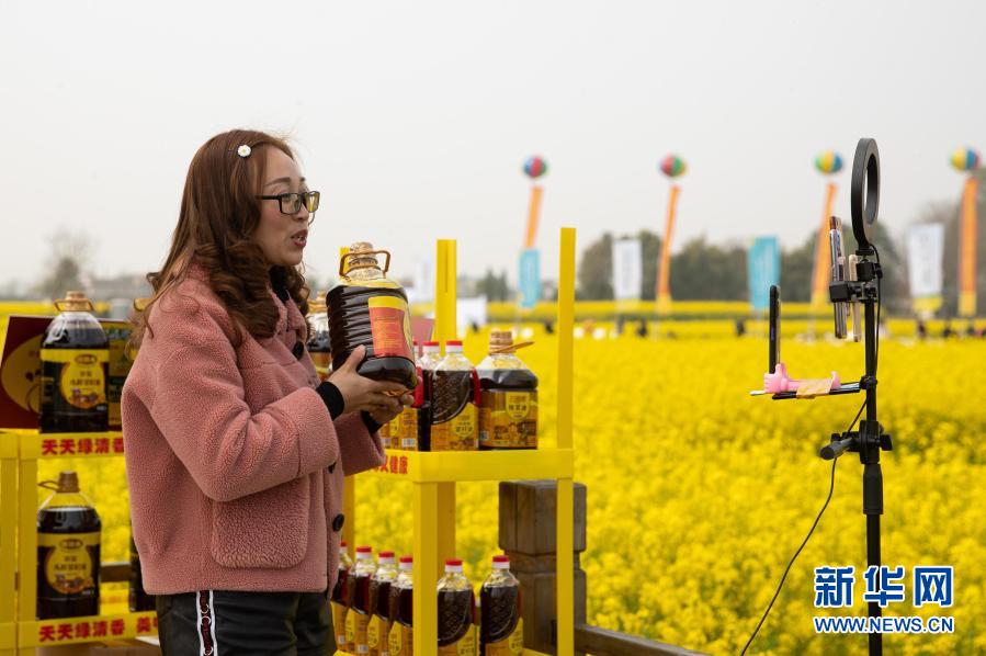 3月14日,在安州區秀水鎮龍泉村的油菜花海邊,一名企業員工在直播銷售菜籽油。新華社記者 江宏景 攝
