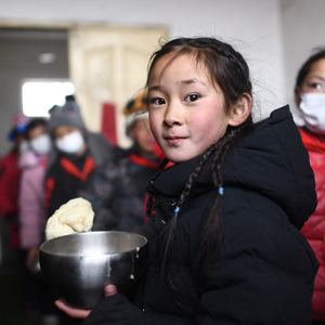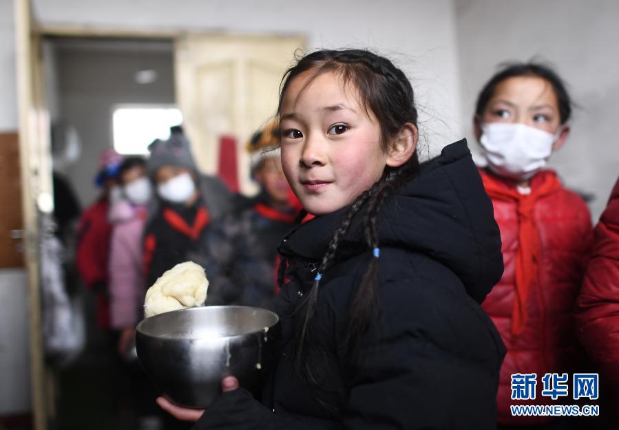 3月16日,在索加鄉寄宿小學食堂,白瑪措毛(前)和同學們一起打飯。