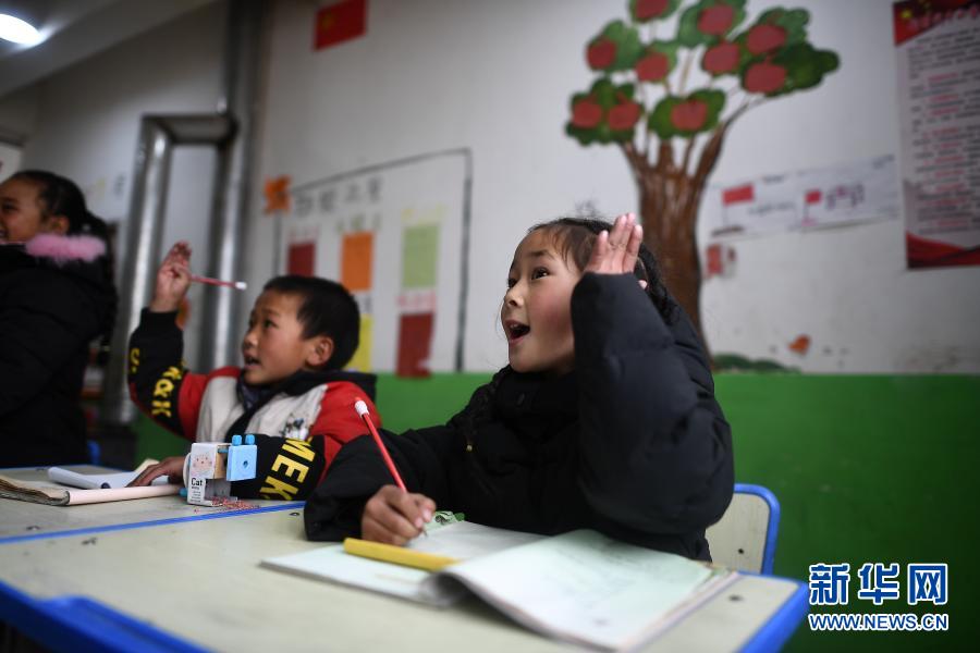 3月16日,索加鄉寄宿小學學生白瑪措毛(右)在藏語文課上舉手回答問題。新華社記者 張宏祥 攝