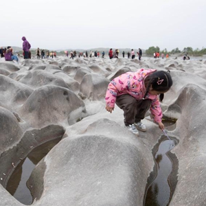 冬春枯水期,四川省涪江江油市青蓮鎮(zhèn)中河村段,約 5000 余平方米的石灘露出水面。石灘凹凸不平,好似起伏的山巒,每天吸引眾多游人前來游玩。據(jù)專家解釋,這種壺穴地貌景觀是由涪江河床的基巖經(jīng)水中裹挾的礫石長時(shí)間沖刷、磨蝕而成。