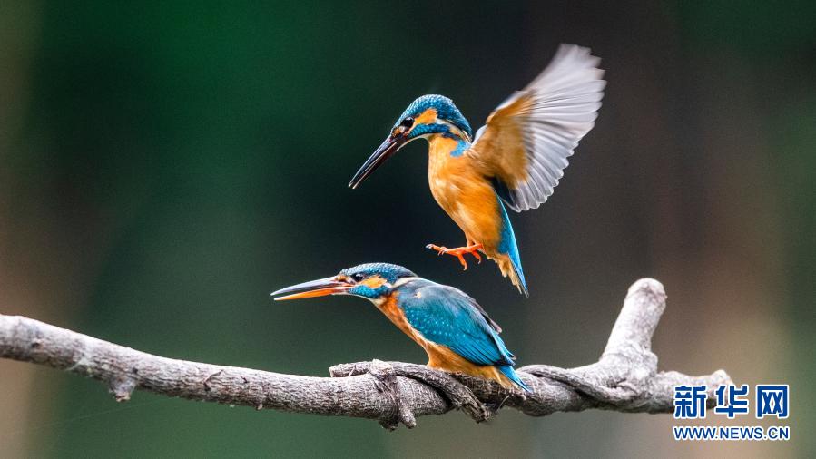 3月22日,在福州西湖公園的荷塘一角,兩只翠鳥在水邊的樹枝上嬉戲。