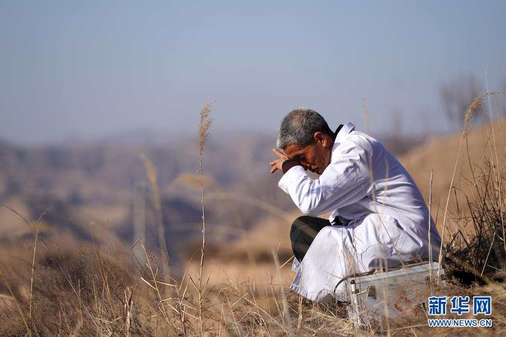 去石樓縣鐵頭村張家灣自然村出診途中,村醫張尚保在路邊擦汗休息(3月23日攝)。新華社記者 詹彥 攝