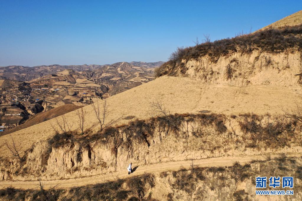 山西省石樓縣鐵頭村的村醫張尚保走在出診的山路上(3月23日攝,無人機照片)。新華社記者 詹彥 攝