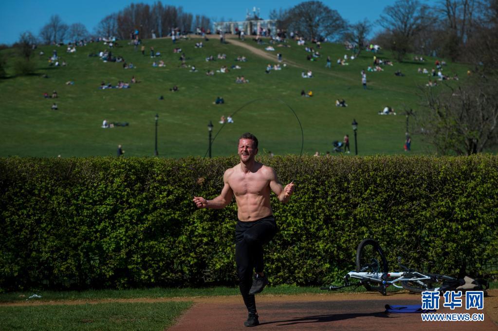 3月29日,一名男子在英國倫敦報春花山的戶外健身區域鍛煉。