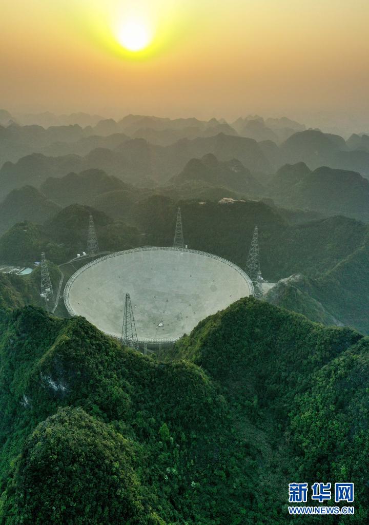在貴州省平塘縣,被譽為“中國天眼”的500米口徑球面射電望遠鏡(FAST)在群山中仰望星空,探求著宇宙奧秘。