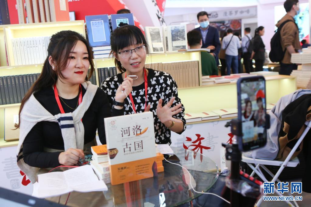 3月31日,參展人員在河南出版展區直播推介書籍。