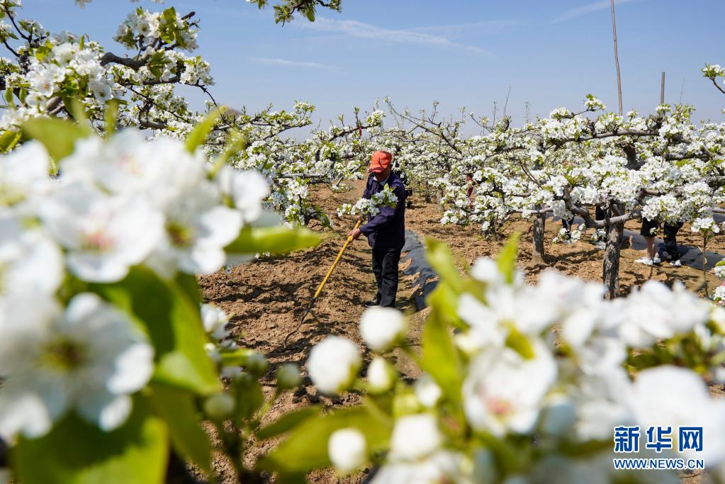 4月5日,在江蘇省連云港市贛榆區贛馬鎮黑坡村黃金梨基地內,果農給梨樹松土。