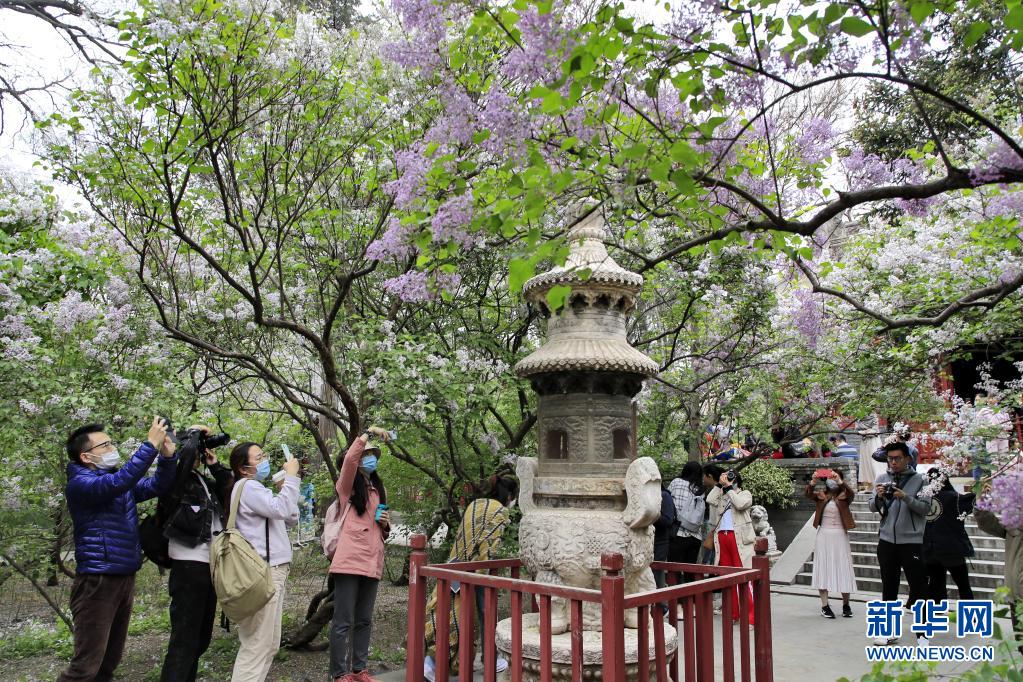4月11日,游客在北京法源寺拍攝盛開的丁香花。新華社發(劉憲國 攝)