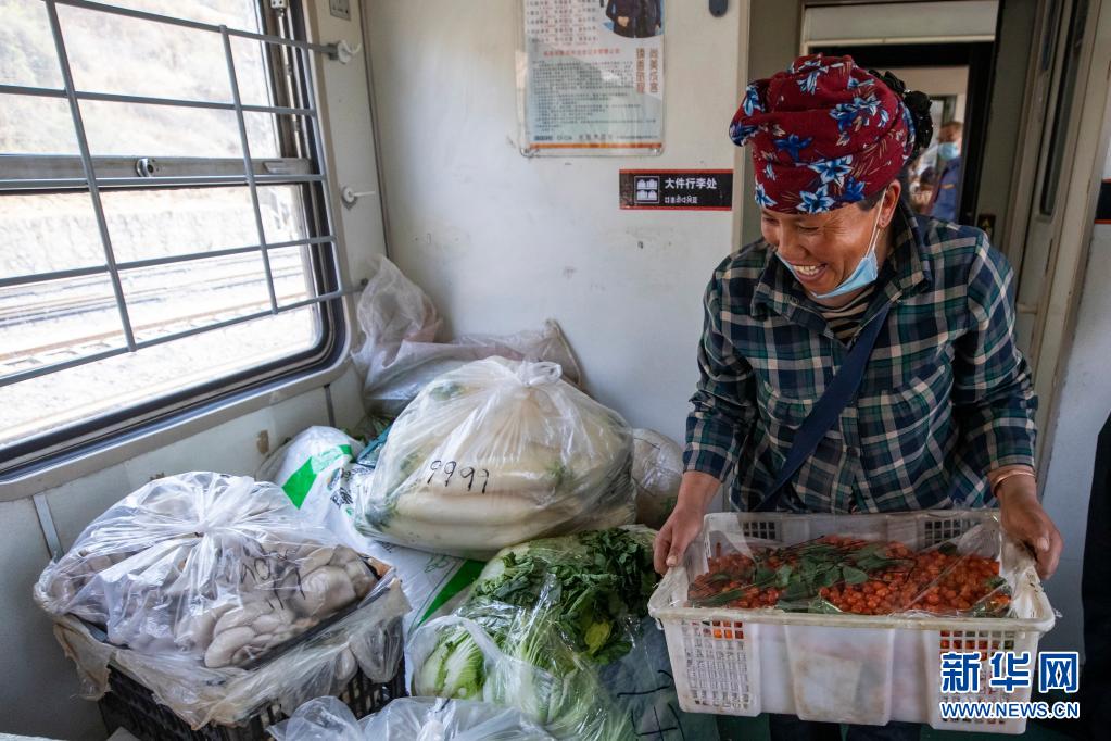 一名彝族商販端著新鮮櫻桃走上5634次列車,她要把這些櫻桃拿去外地售賣(4月12日攝)。新華社記者 沈伯韓 攝