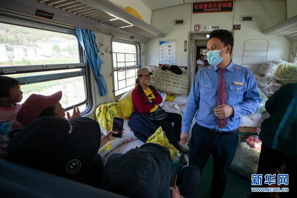 中國鐵路成都局集團公司成都客運段5634次列車員吉木阿且(右一)在車廂里與彝族乘客交流(4月12日攝)。5633/5634次列車配備了6名彝族列車員,以更好地為當地彝族百姓服務。新華社記者 沈伯韓 攝