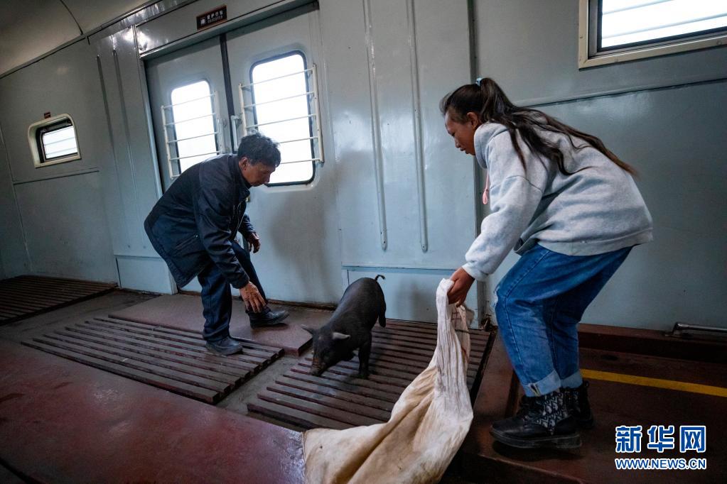 在5633次列車的行李車廂,乘客準備把他們帶上車的小豬裝到袋子里。為了方便群眾運送動物,5633/5634次列車對行李車廂專門進行改造,黃牛、山羊、豬、馬,都是這兒的“??汀?。新華社記者 沈伯韓 攝