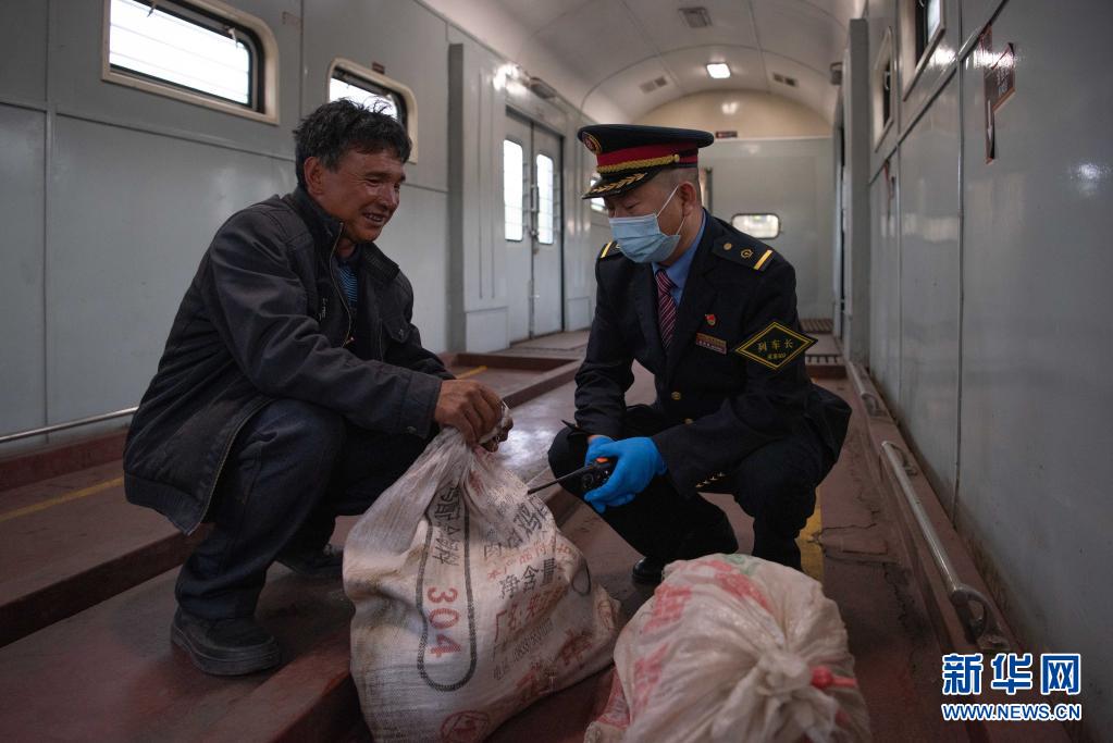在5633次列車的“行李車廂”內,中國鐵路成都局集團公司成都客運段5633/5634次列車長劉偉(右)了解村民攜帶牲畜情況(4月11日攝)。新華社記者 胥冰潔 攝