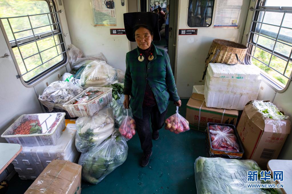 一名彝族小商販拎著新鮮蘋果走上5634次列車,車廂兩邊堆滿了蔬菜水果等貨品(4月12日攝)。新華社記者 沈伯韓 攝