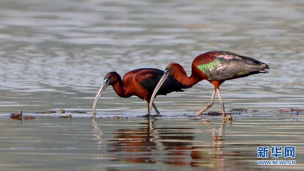 彩鹮在福建省霞浦縣福寧灣灘涂覓食(4月17日攝)。一對(duì)彩鹮近日現(xiàn)身福建省霞浦縣福寧灣灘涂的視頻,經(jīng)當(dāng)?shù)孛襟w播發(fā)后引起轟動(dòng),各地?cái)z影師及當(dāng)?shù)厣鷳B(tài)保護(hù)志愿者紛至沓來,一睹它們的“芳容”。新華社記者 梅永存攝
