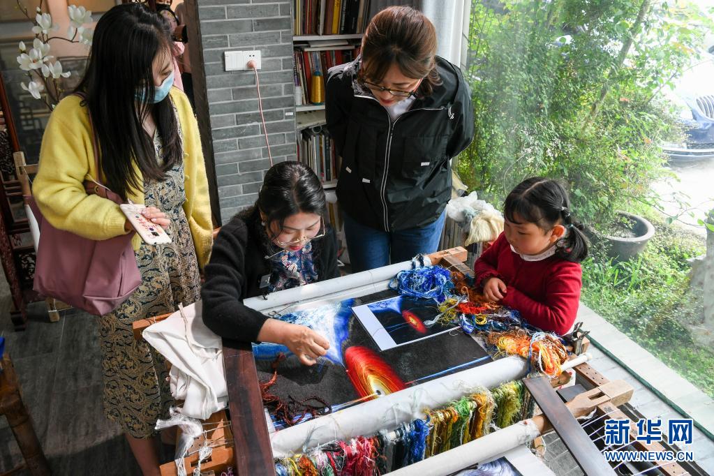 在位于蘇州高新區鎮湖街道的蘇繡工作室內,陳英華(右三)為前來參觀的客人展示蘇繡技法(4月14日攝)。新華社記者 李博 攝