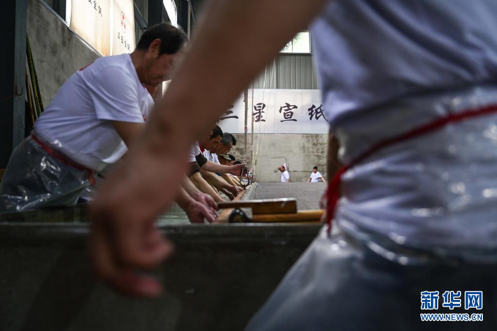 近日,在宣紙產地安徽省宣城市涇縣,“四丈宣紙”的抄制在一家紙業有限公司啟動。50余名撈紙師傅操作巨型紙簾,齊心協力,在紙槽旁進行撈紙作業。來回起落兩次,動作整齊劃一。隨后工人們將紙簾吊起放至一邊揭下,一張巨大的宣紙便撈制成功。經過曬、剪等工序后, 制成長13.2米、寬3.6米的巨型宣紙就是“四丈宣紙”。