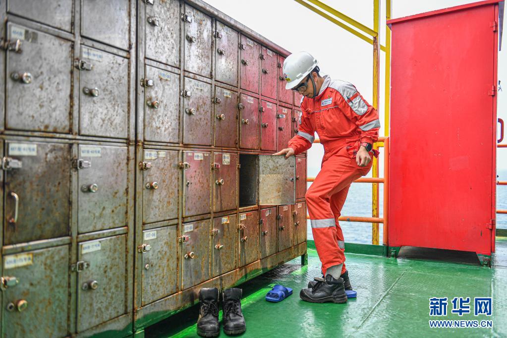 4月25日,中國海油樂東15-1氣田上的一名工人在進入氣田作業區之前戴上安全帽并換上有助于保護腳部的工作靴。