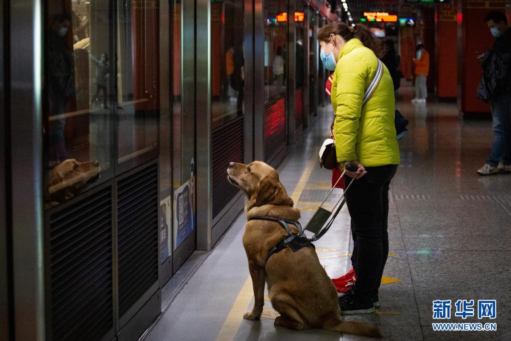 導盲犬“多多”陪伴祝愛葉在地鐵站內準備乘坐地鐵(3月13日攝)。 新華社發 (張夢 攝)