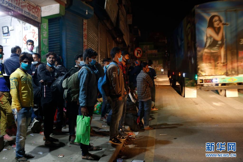 4月28日晚,人們在尼泊爾首都加德滿都的路邊等車,準備在封禁措施實施前離開加德滿都返回家鄉。