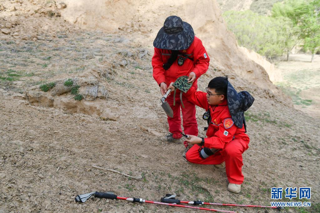 4月28日,巡線隊員侯勵峰、曹碩(右)在巡線途中組裝工具。新華社記者 張博文 攝