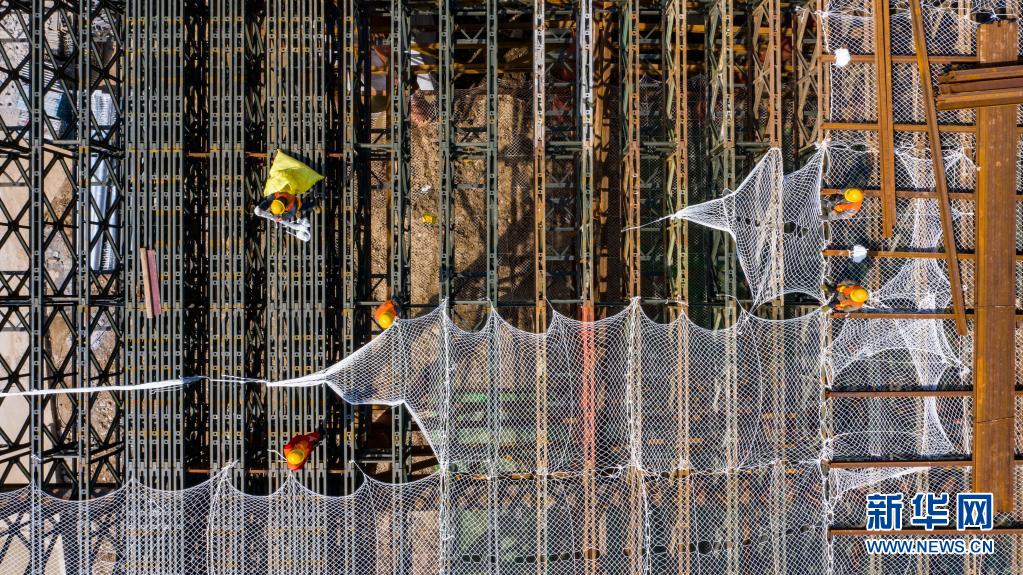5月1日,在湖北襄陽內環(huán)線項目跨襄北編組站大橋施工現場,中鐵十一局建設者在進行安全防護網掛設施工(無人機照片)。